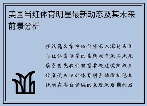 在这篇文章中,我们将深入探讨美国当红体育明星的最新动态及其未来前景。首先,我们将简要概述现阶段几位最受关注的体育明星的现状,包括他们在各自领域的表现及近期的成就。接着,文章将从四个主要方面进行详细分析:体育明星的个人表现与成就、市场价值与商业影响、未来发展潜力以及他们在社会文化中的地位。通过这些分析,我们不仅能了解这些明星目前的状况,还能对他们的未来前景进行准确预测。最终,我们将总结这些分析的主要发现,并对未来的发展趋势进行展望。