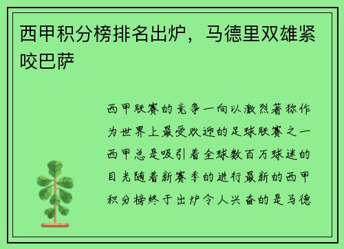 西甲联赛的竞争一向以激烈著称,作为世界上最受欢迎的足球联赛之一,西甲总是吸引着全球数百万球迷的目光。随着新赛季的进行,最新的西甲积分榜终于出炉。令人兴奋的是,马德里双雄——皇家马德里和马德里竞技,正以微弱的差距紧咬排名榜首的巴塞罗那。这一排名不仅让球迷们充满期待,也让本赛季的西甲争冠悬念陡增。