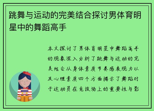 本文探讨了男体育明星中舞蹈高手的现象,深入分析了跳舞与运动的完美结合。从身体素质、节奏感、表现力以及心理素质四个方面,揭示了舞蹈对于运动员在竞技场上的重要性与影响。我们将通过具体的实例,展示如何通过舞蹈提升运动表现,以及这些明星如何将舞蹈融入他们的训练与比赛中。最终,文章强调舞蹈不仅是艺术的表现,更是体育运动中不可或缺的一部分,展现了两者结合的独特魅力。