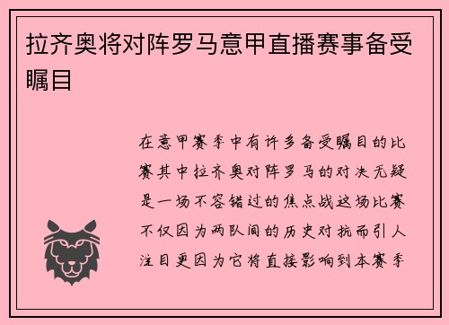 拉齐奥将对阵罗马意甲直播赛事备受瞩目